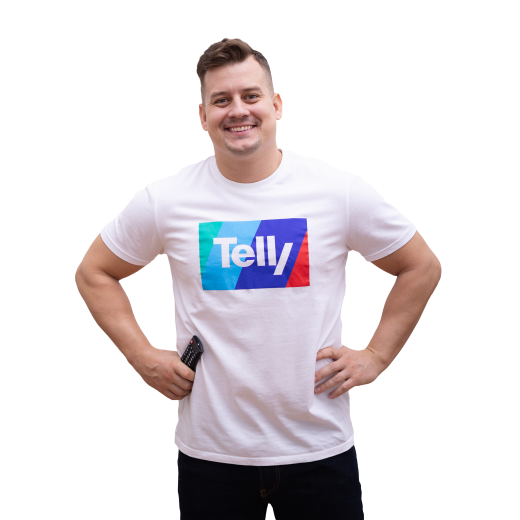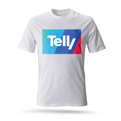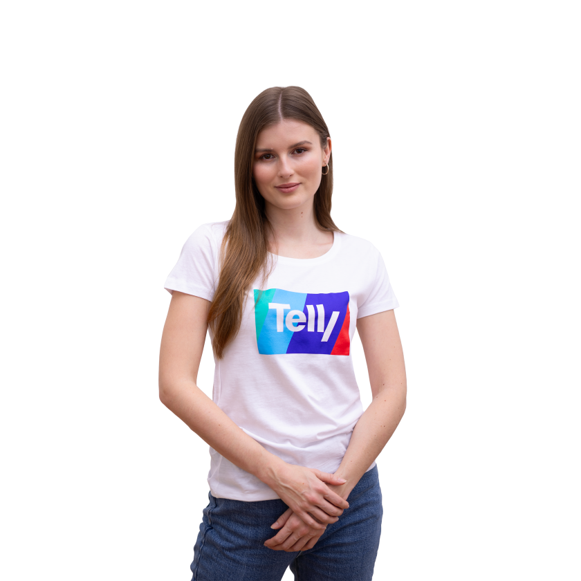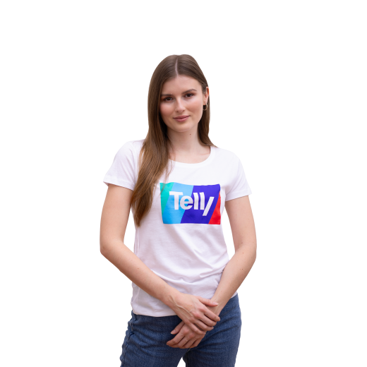 Bílé bavlněné tričko s kulatým výstřihem a potiskem Telly. Tabulka s rozměry ke stažení zde