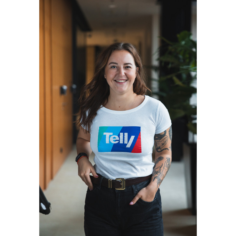 Bílé bavlněné tričko s kulatým výstřihem a potiskem Telly. Tabulka s rozměry ke stažení zde